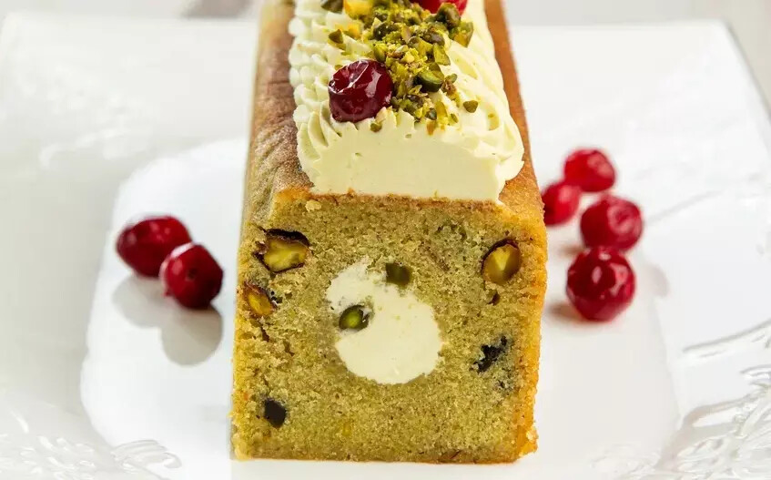 Ароматный фисташково-зеленый мякиш с яркими каплями клюквы — это экзотический вариант кекса для настоящих гурманов. Наполнение — взбитый фисташковый ганаш