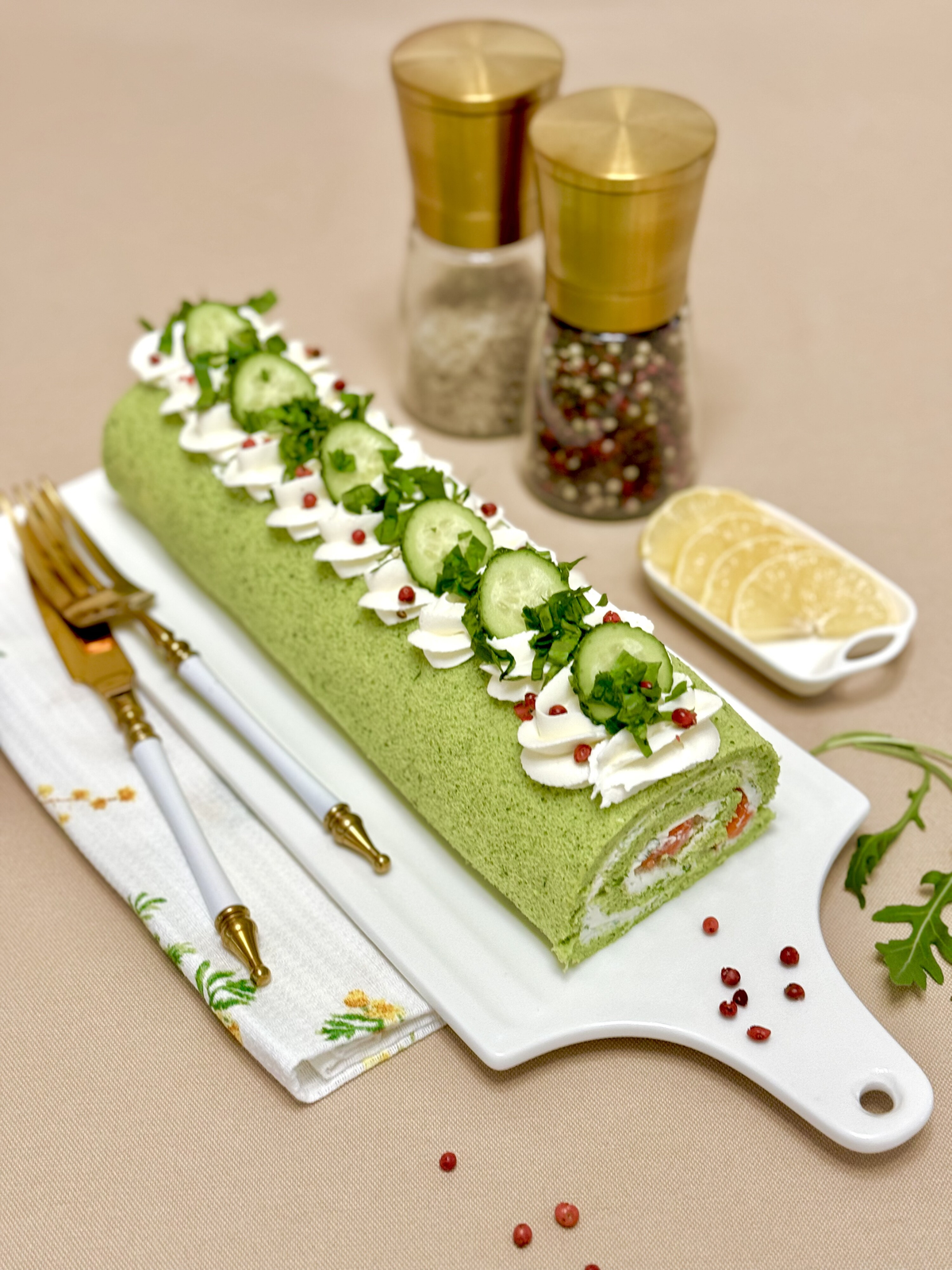 - Финальный декор — свежая зелень, цедра, кусочки овощей и икра